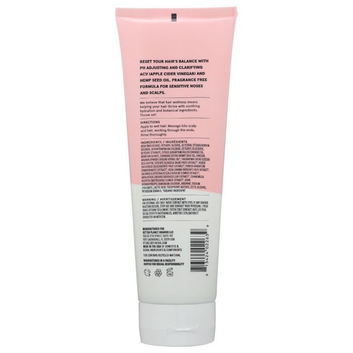 Fragrance free, hemp seed oil & apple cider vinegar.Hair reset for styled, swim & harsh conditions.Reset your hair’s balance with ph adjusting and clarifying acv (apple cider vinegar) and hemp seed oil. Fragrance free formula for sensitive noses and scalps.