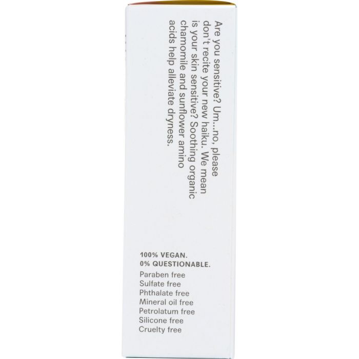 With argan oil & sunflower amino acids, for normal to sensitive skin. Are you sensitive? Um...no, please don't recite your new haiku. We mean is your skin sensitive? Soothing organic chamomile and sunflower amino acids help alleviate dryness.
