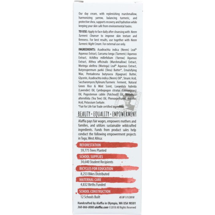 Alaffia's day cream, with replenishing marshmallow, harmonizing yarrow, balancing turmeric and protective shea, supports recovery and hydration while keeping your skin safe from environmental toxins. Ideal for an uneven complexion and blemish prone skin. TO USE: Apply to face daily after cleansing with Neem Turmeric Cleanser to improve skin texture and firmness. For best results, use together with Neem Turmeric Night Cream. For external use only.