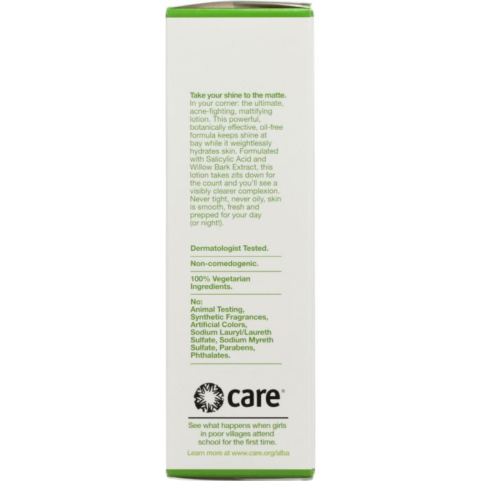 take your shine to the matte In your corner: the ultimate, acne-fighting, mattifying lotion. This powerful, botanically effective, oil-free formula keeps shine at bay while it weightlessly hydrates skin. Formulated with Salicylic Acid and Willow Bark Extract, this lotion takes zits down for the count and you'll see a visibly clearer complexion. Never tight, never oily, skin is smooth, fresh and prepped for your day (or night!).