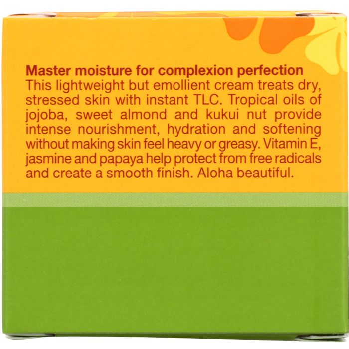 This lightweight but emollient cream treats dry, stressed skin with instant TLC. Tropical oils of jojoba, sweet almond and kukui nut provide intense nourishment, hydration and softening without making skin feel heavy or greasy. Vitamin E, jasmine and papaya help protect from free radicals and create a smooth finish. Aloha beautiful.