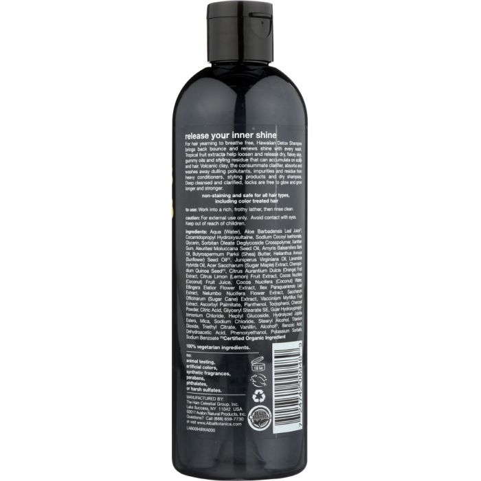 release your inner shine For hair yearning to breathe free, Hawaiian Detox Shampoo brings back bounce and renews shine with every wash. Tropical fruit extracts help loosen and release dry, flakey skin, gummy oils and styling residue that can accumulate on scalp and hair. Volcanic clay, the consummate clarifier, absorbs and washes away dulling pollutants, impurities and residue from heavy conditioners, styling products and dry shampoos. Deep cleansed and clarified, locks are free to glow and grow longer and stronger.