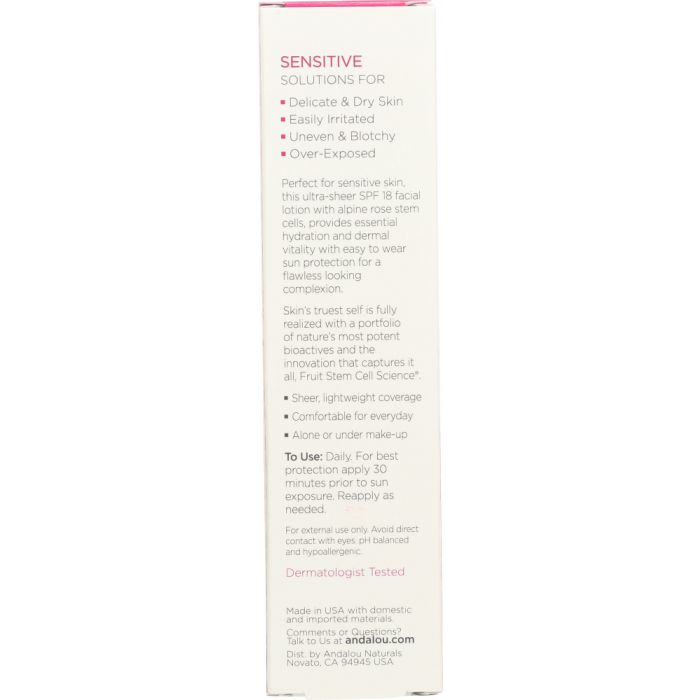 Perfect for sensitive skin, this ultra-sheer SPF 18 facial lotion with Alpine Rose Stem Cells, provides essential hydration and deep cellular support with proven UVA/UVB sun protection for a naturally flawless complexion. Sheer, lightweight coverage Wear alone or under make-up Comfortable for everyday Broad Spectrum Protection Non GMO Cruelty-Free Gluten-Free Vegan Dermatologist Tested