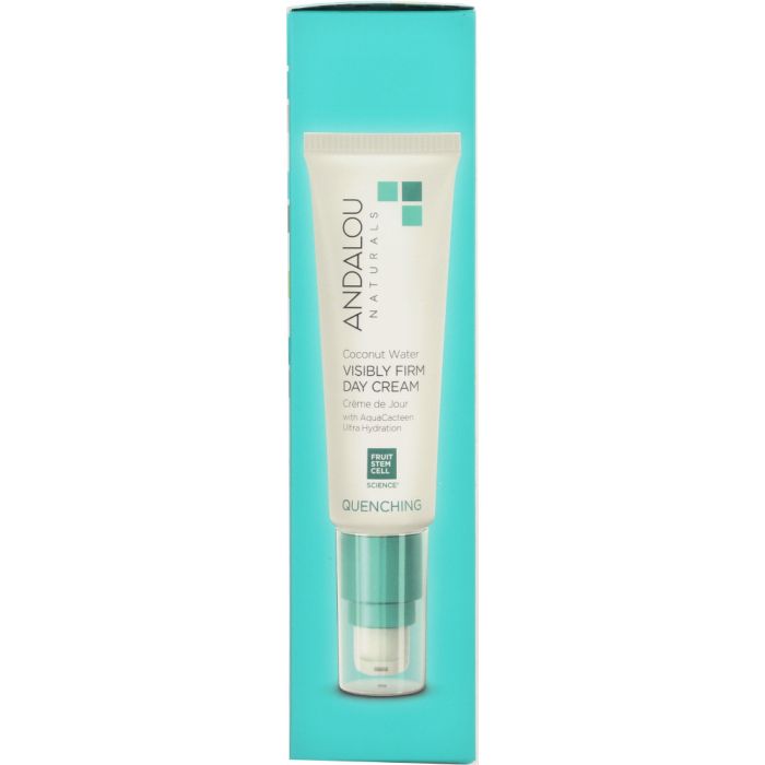 Andalou Naturals Coconut Water Visibly Firm Facial Day Cream silky day cream instantly hydrates, fortifies, and balances. Improving the appearance of tone and texture with skin-friendly enzymes, vitamin C, and coconut water electrolytes for a healthy, smooth complexion. AquaCacteen, derived from prickly pear cactus, nourishes and soothes as water-binding nutrients provide lasting hydration for a lifted, firmer appearance and renewed vitality.
