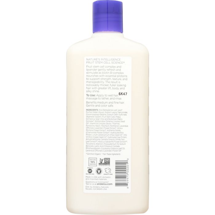 Lavender gently refreshes, stimulating follicles and circulation. Biotin B-complex infuses essential protein for thicker, fuller strands, improved strength, texture and manageability for maximum volume and silky sheen. Fruit Stem Cell Science improves hair follicle longevity and vitality for healthy hair from root to tip. Non GMO Cruelty-Free Gluten-Free Vegan 100% Sulfate Free and Color Safe Benefits medium and fine hair.
