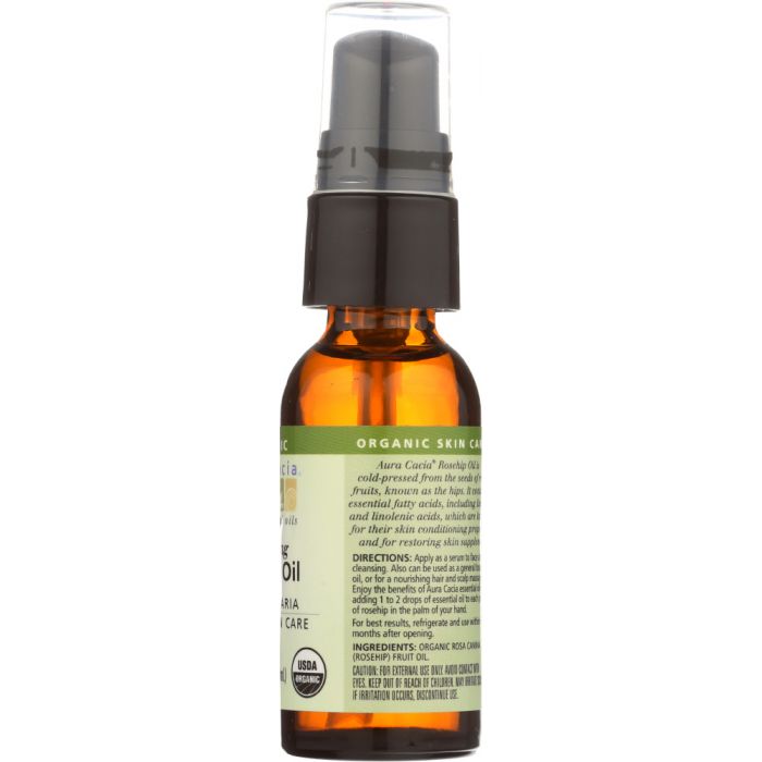 Suggested Uses: Can be used as a serum to face after cleansing, as a general body oil to soften and rejuvenate skin, and to nourish hair. Enjoy the benefits of Aura Cacia essential oils by adding 1 to 2 drops of essential oil to each pump of rosehip in the palm of your hand. For best results refrigerate and use within 6 months after opening. Safety Notes: CAUTION: FOR EXTERNAL USE ONLY. AVOID CONTACT WITH EYES. KEEP OUT OF REACH OF CHILDREN. Product Notes: Rosehip oil contains pure retinol (Vitamin A), which is best known for replenishing and restoring mature or sun-damaged skin. It also contains essential fatty acids, including linoleic and linolenic acids, which are known for their skin conditioning properties and for restoring suppleness.