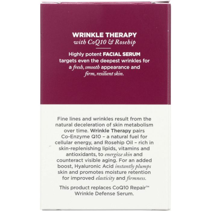 Highly potent Facial Serum is scientifically proven to target even the deepest wrinkles for a fresh, smooth appearance and firm, resilient skin. Clinically Proven 86% of users reported the appearance of lines around their eyes was reduced after 4 weeks of daily use. This product replaces CoQ10 Repair™ Wrinkle Defense Serum. The new and improve formula now contains antioxidant-intensive rosehip oil for added wrinkle-fighting benefits. NSF/ANSI 305 certified No GMOs Vegan Biodegradable No parabens No phthalates No synthetic fragrances or colors