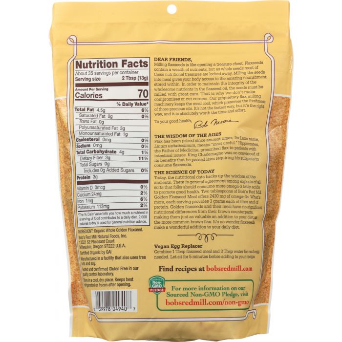 Organic Golden Flaxseed Meal is ground on cool mills which both preserves the healthful oils and increases bioavailability of nutrients. Very mild-flavored, sprinkle over just about any dish to add omega-3 fatty acids and fiber to your diet.