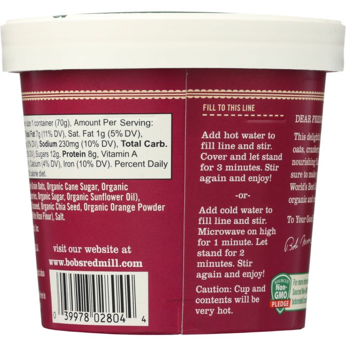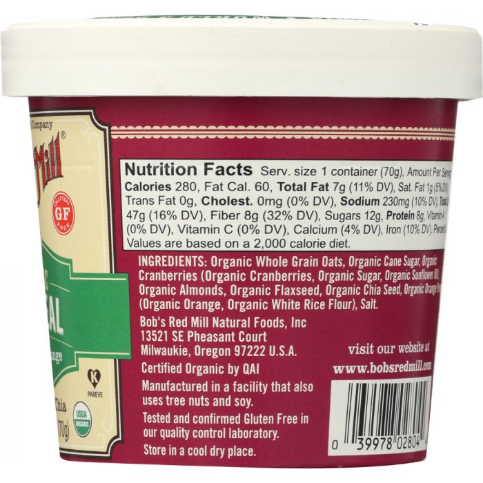 Our Organic Cranberry Orange Oatmeal Cup is made from a tasty blend of gluten free Quick Cooking Rolled Oats, Old Fashioned Rolled Oats, and creamy, stone ground Scottish Oatmeal. To that nutritious whole grain base, we added cranberries, almonds, flaxseeds, chia seeds and oranges, plus pure cane sugar for a touch of sweetness. Packed with fiber, protein, vitamin C and iron, this hearty cup will give you the fuel you need to get through your busy morning. Just add hot water or pop it in the microwave, wait three minutes, and breakfast is ready! Take it with you to the office, to school, on camping trips, or when you travel. Eating healthy on the go has never been so easy!