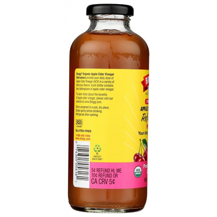 Organic raw apple cider vinegar juiced up with polyphenol-rich pomegranates and cherries. This all-organic blend packs a satisfying punch.Bragg Organic Apple Cider Vinegar Refreshers provide your daily dose of Apple Cider Vinegar (ACV) in a variety of delicious flavors. Each bottle contains two tablespoons of apple cider vinegar.
