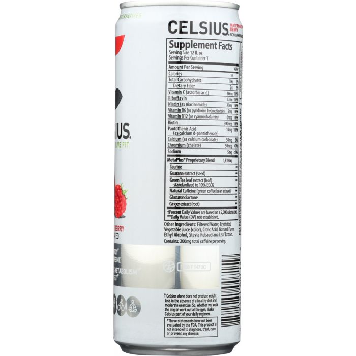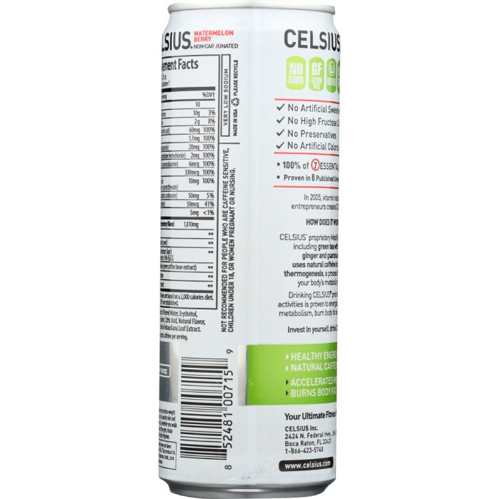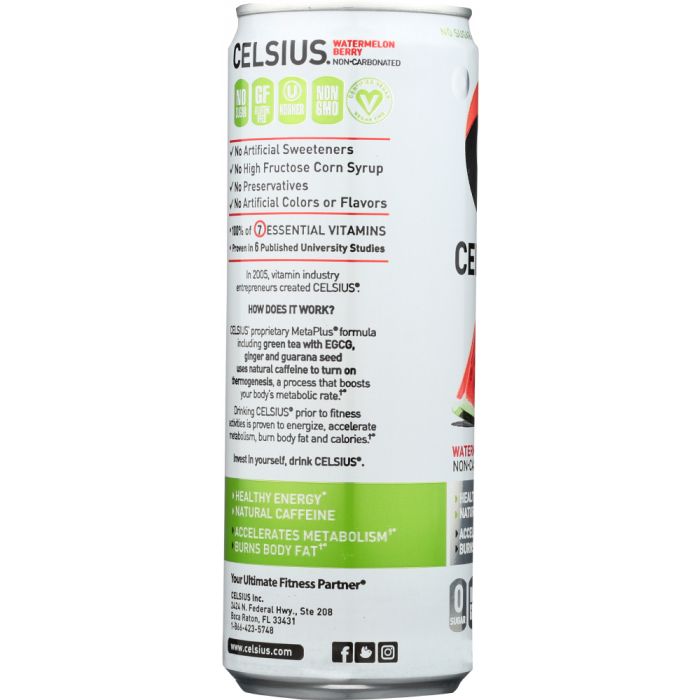 CELSIUS: BEVERAGE WATERMELON BERRY (12.000 OZ) CELSIUS’ first line extension is both naturally sweetened and naturally caffeinated. CELSIUS Naturals! Available in all new sparkling and non-carbonated flavors, CELSIUS Naturals contains the same propriety formula proven to accelerate metabolism, burn body fat and provide healthy energy.