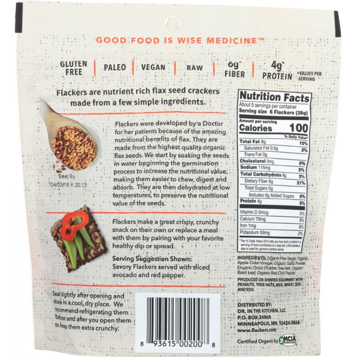 DOCTOR IN THE KITCHEN: Flackers Flax Seed Crackers Savory Garlic-Onion-Basil and Red Chile Pepper, 5 oz