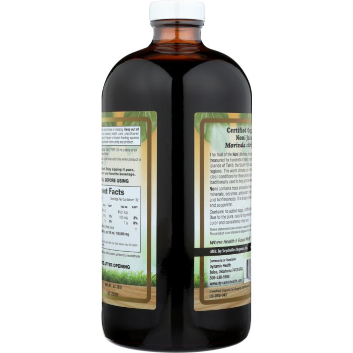 Dynamic Health 100 Percent Pure Organic Noni Juice, 32 Ounce -- 3 per case. Noni Juice from Tahiti Morinda Citrifolia It is believed that the Noni (Morinda Citrifolia) tree originated in Southeast Asia about two thousand years ago. Since that time, the precious fruit of the Noni tree has been distributed throughout the islands of the South Pacific, as the tree will only thrive in the delicate ecosystem of the tropics. The great gifts of the Noni fruit are well-known in tropical cultures. Noni Juice (Morinda Citrifolia) has traditionally been used to cleanse and purify the entire system, as a defense against illness, to aid digestion, to heal abrasions, to reduce swelling and inflammation and reduce pain.