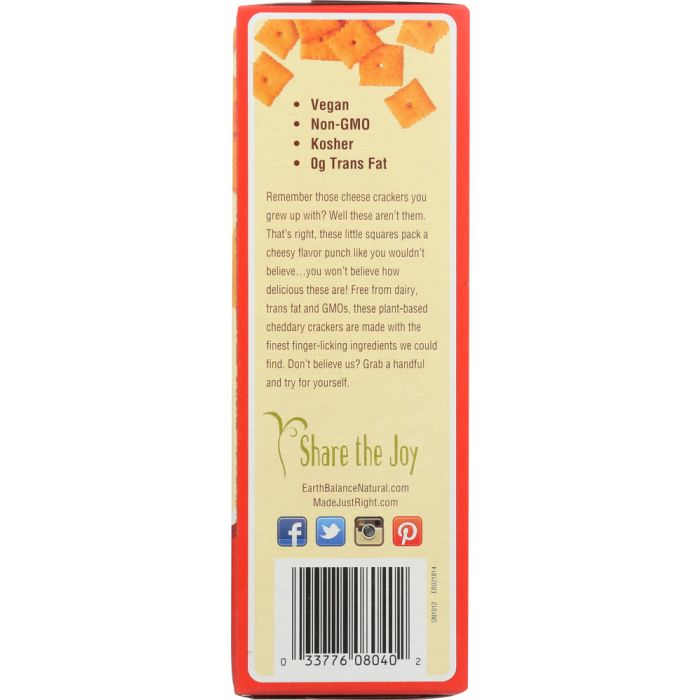 Remember those cheese crackers you grew up with? Well these aren't them. That's right, these little squares pack a cheesy flavored punch like you wouldn't believe...and we bet you can't stop eating them! Free from dairy, trans fat & GMO's, these plant based cheddary flavored crackers are made with the finest finger-licking ingredients we could find. Don't believe us? Grab a handful and try yourself - you won't be sorry.