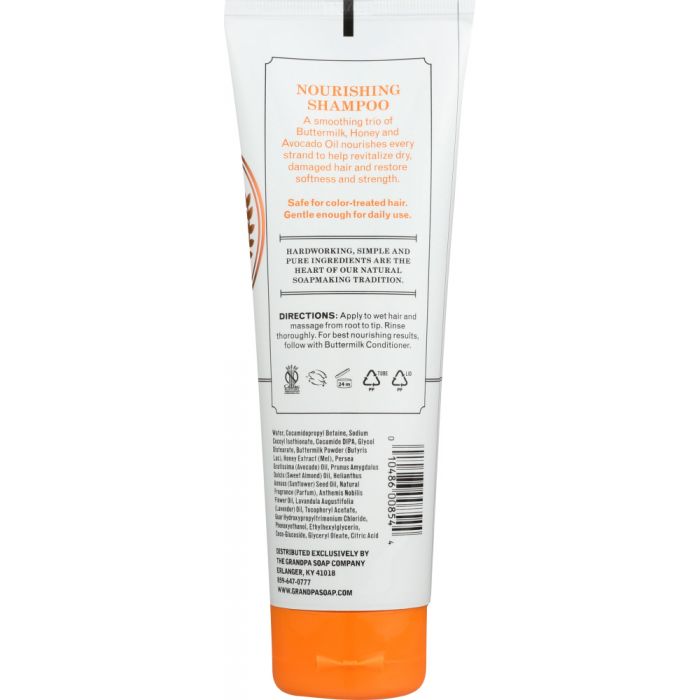 GRANDPAS: SHAMPOO BTTRMLK (8.000 OZ) Description Since 1878 Proudly Made in America Helps Revitalize Dry, Damaged and Color-Treated Hair Buttermilk - Honey - Avocado Oil Dry Damaged Hair Cruelty Free Formula Celiac Support Association Certified Gluten Free Nourishing Shampoo A smoothing trio of Buttermilk, Honey and Avocado Oil nourishes every strand to help revitalize dry, damaged hair and restore softness and strength. Safe for color-treated hair. Gentle enough for daily use. Hardworking, simple and pure ingredients are the heart of our natural soapmaking tradition. Suggested Use Apply to wet hair and massage from root to tip Rinse thoroughly. For best nourishing results, follow with Buttermilk Conditioner. Other Ingredients Water, cocamidopropyl betaine, sodium cocoyl isethionate, cocamide dipa, glycol distearate, buttermilk powder (butyris lac), honey extract (mel), persea gratissima (avocado) oil, prunus amygdalus dulcis (sweet almond) oil, helianthus annuus (sunflower) seed oil, natural fragrance (parfum), anthemis nobilis flower oil, lavandula angustifolia (lavender) oil, tocopheryl acetate, guar hydroxypropyltrimonium chloride, phenoxyethanol, ethylhexylglycerin, coco-glucoside, glyceryl oleate, citric acid. No sulfates, parabens, phthalates, edta, glutens, silicones, peg, petroleum, ethoxylates, artificial fragrances or colorants