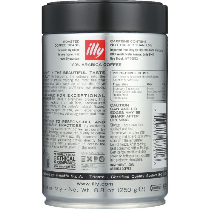 illy whole bean coffee is the perfect choice for coffee lovers who prefer grinding the beans to suit their own individual taste and preparation method. illy’s distinctive blend of fine Arabica coffees with a smooth, rich and full-bodied taste is created from the skillful blending of 100% sustainably-grown Arabica beans, meticulously selected from different growing regions around the world. The result is an authentic Italian coffee that is flawlessly consistent, smooth, balanced, and never bitter – perfect for all coffee preparations. Using an exclusive process, illy coffee is packed in an air-free, pressurized can that enhances and seals in the precious aromas and oils, so you enjoy the freshest taste – cup after cup.