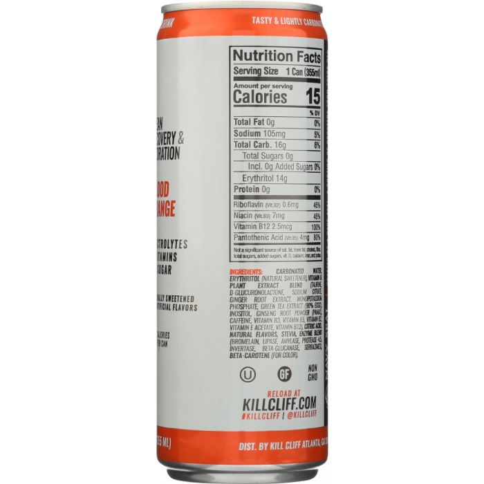 The OG of recovery drinks, our tasty Blood Orange flavor is still the go-to favorite for die hard Kill Cliff fans. Made with a unique recovery blend including essential electrolytes, B-vitamins, enzymes, and extracts like ginger root, ginseng root, and green tea. Contains no sugar, no artificial sweeteners, no artificial colors, and no artificial flavors. Gluten free, dairy free, and non GMO. Lightly carbonated for killer taste and only 15 calories per 12 ounce can. Perfect after a workout, a night out, or any other time you need to get back to full speed. It even works as an everyday soda replacement.
