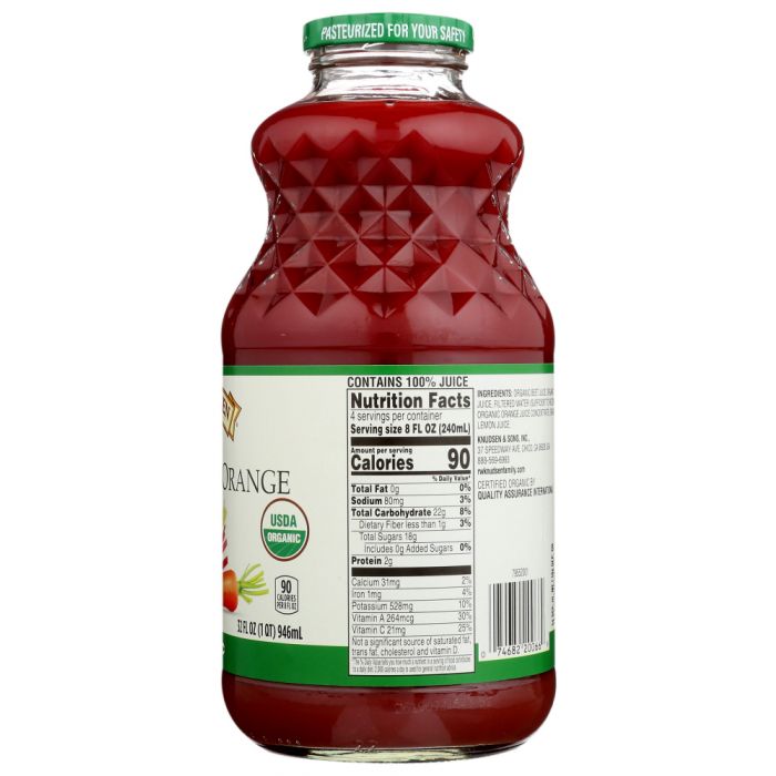 R.W. KNUDSEN Organic Beet Carrot Orange Juice, an organic Beet, Carrot, and Orange juice blend concentrate. Today you and your family can enjoy the R.W Knudsen Family products made with the same commitment. Savor the refreshing goodness crafted with integrity and care.