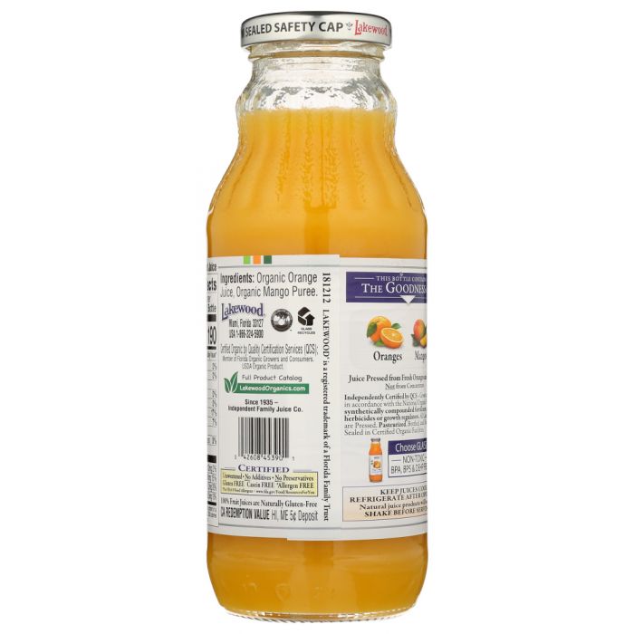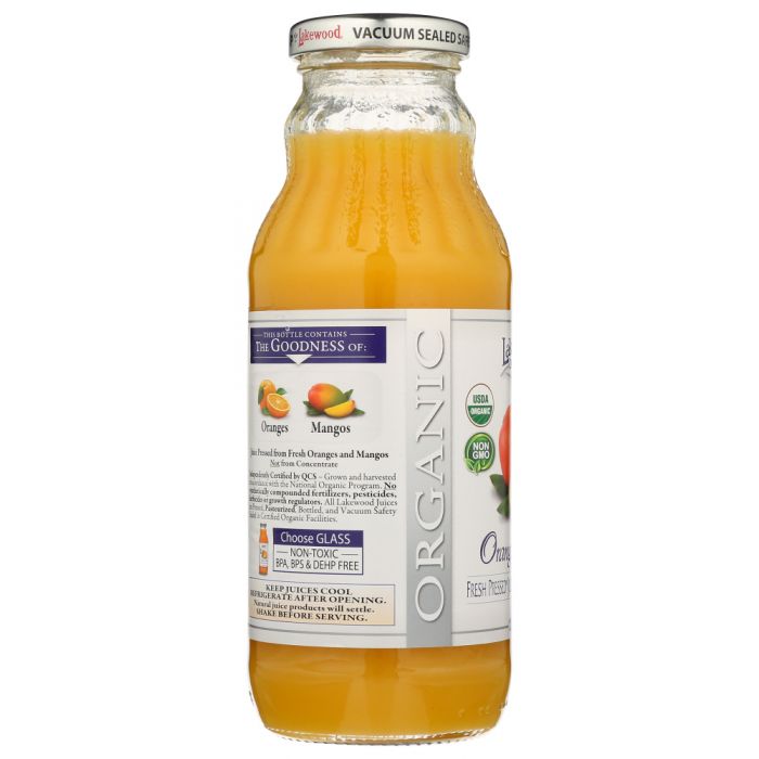 Juice Pressed from Fresh Oranges and Mangos Independently Certified by QCS - Grown and harvested in accordance with the National Organic Program. No synthetically compounded fertilizers, pesticides, herbicides or growth regulators. All Lakewood Juices are Pressed, Pasteurized, Bottled, and Vacuum Safety Sealed in Certified Organic Facilities. KEEP JUICES COOL, REFRIGERATE AFTER OPENING. Natural juice products will settle. SHAKE BEFORE SERVING. Available in 12.5oz container.