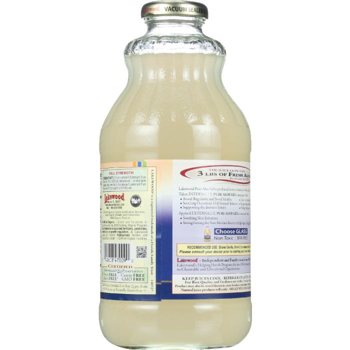 Juice Pressed from Fresh Aloe Vera Independently Certified by QCS- Grown and harvested in accordance with the National Organic Program. No synthetically compounded fertilizers, pesticides, herbicides or growth regulators. All Lakewood Juices are Pressed, Pasteurized, Bottled and Vacuum Safety Sealed in Certified Organic Facilities. Variety of Aloe: Aloe barbadensis KEEP JUICES COOL - REFRIGERATE AFTER OPENING For Best Quality and Freshness use within 2 weeks of opening. Product may also be stored frozen in a non-breakable container or freeze into ice cubes. Natural juice products will settle. SHAKE BEFORE SERVING.