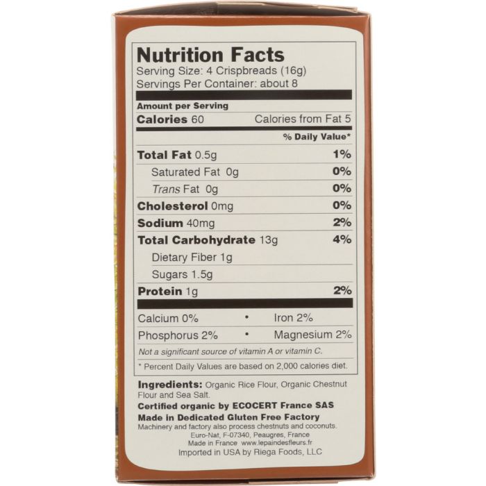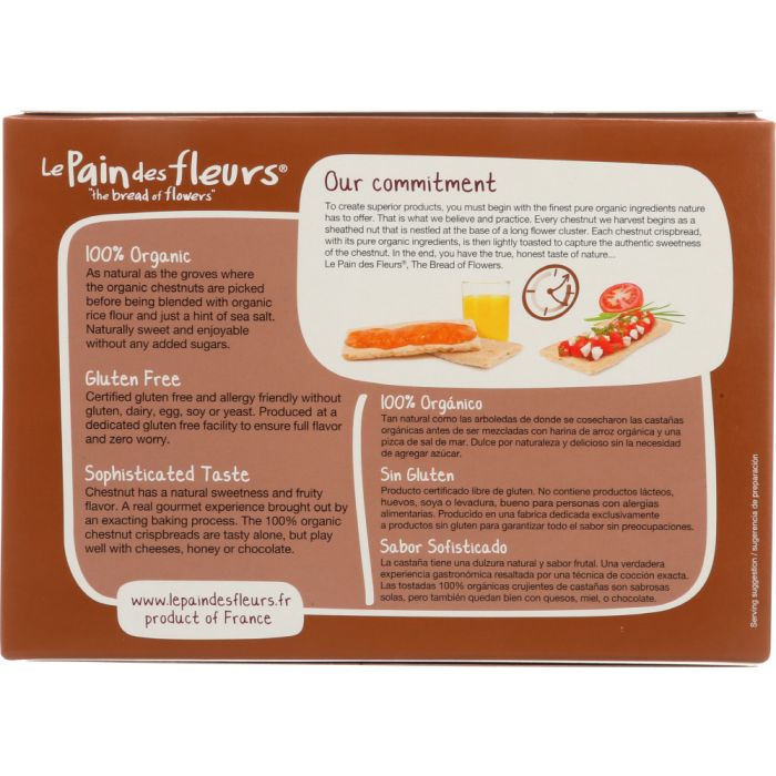 Le Pain des Fleurs Chestnut Crispbreads are baked to an exacting standard and made with only the finest of chestnuts. This dedication to flavor helps bring out the natural sweetness and fruity flavor of the chestnut in every bite. Made with 100 Percent Organic Ingredients in a dedicated gluten free factory. Le Pain des Fleurs crispbreads are the perfect addition to any lunch, dinner party or as a quick bite in your kids backpack.