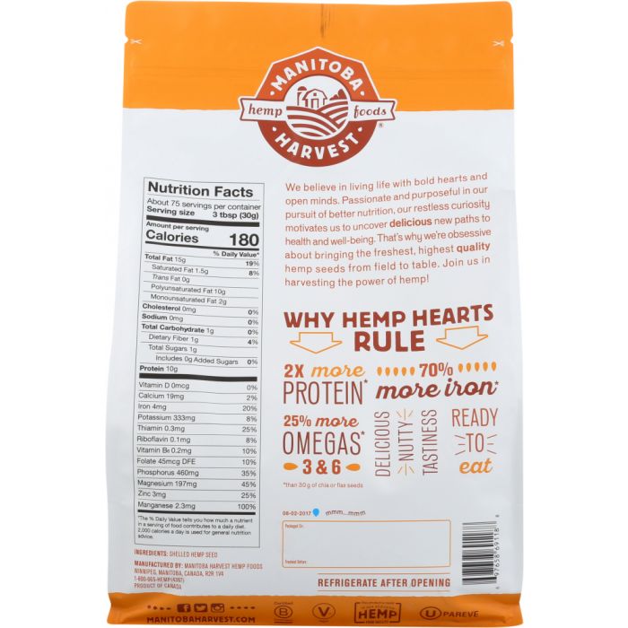 Manitoba Harvest Hemp Hearts Natural Raw Shelled Hemp Seeds have 10 grams of omega 3 & 6 per serving. It has a nutty flavor and is the most versatile product Manitoba Harvest carries. Hemp Hearts, the very best and most nutritious part of the hemp seed, the heart. By shelling the hemp seed, you get only the center, with its raw nutrition, rich nutty flavor and tender crunch. So easy to use, eat them straight out of the package or sprinkle on anything - salad, cereal or yogurt. The only limit is your imagination!