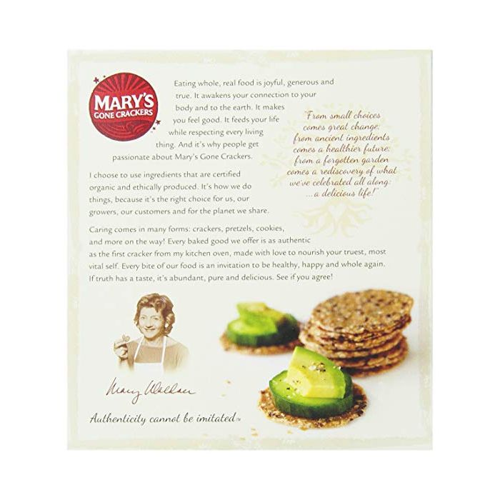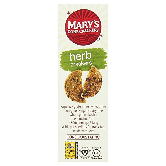 This is our original cracker under the influence of herbs. A select blend of organic herbs and spices brings a culinary flair to our traditional recipe of organic, gluten free, whole grain brown rice, quinoa, flax seeds, and sesame seeds. Mary’s Gone Crackers® Herb Crackers appeal to your epicurean side with fields of rosemary, a touch of garlic and even a hint of lemon.