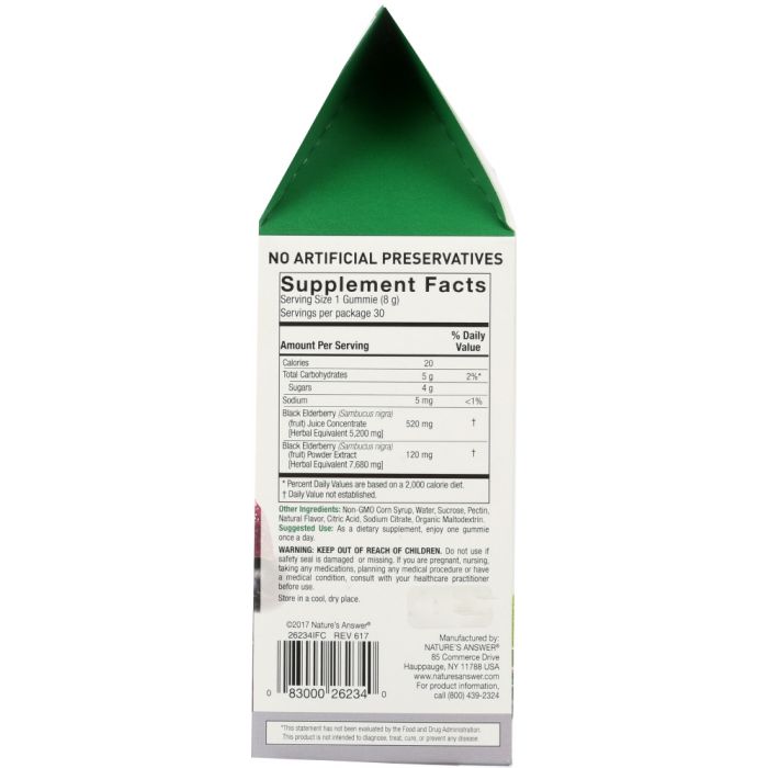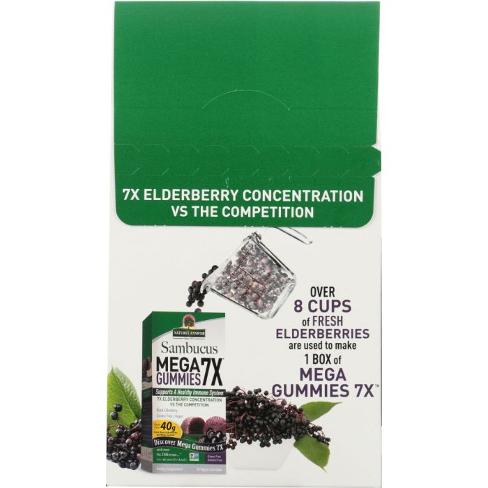 Sambucus Gummies Finally, Sambucus Gummies that give you all the antioxidant power of the Black Elderberry and taste great, too… Nature’s Answer Sambucus Mega Gummies 7X. Each gummie is packed with important antioxidants. In fact, Black Elderberries have twice the antioxidants of blueberries, and more antioxidants than cranberries and goji berries. Nature’s Answer packs more black elderberries into each Sambucus Gummie than anyone else, helping support your immune system every day of the year.* Nature’s Answer Unique Bio-Chelation process. Only Nature’s Answer uses a unique Bio-Chelation process, developed by the company’s founder and owner. It includes “cold extraction.” Cold extraction, allows the raw plant materials to be extracted without being exposed to heat, capturing and preserving the holistic balance of the Elderberry, and maximizing its natural health benefits in every gummie. The Black Elderberry has Twice the antioxidants of Blueberries and more antioxidants than blackberries, cranberries and goji berries The Added Assurance of Nature’s Answer “Advanced Botanical Fingerprint” Technology™ Nature’s Answer Advanced Botanical Fingerprint Technology™ assures you of the quality of the botanical ingredients in every Nature’s Answer product. By creating one of the most comprehensive collections of plant specimens in the world and identifying each plant’s distinctive botanical fingerprint, Nature’s Answer can compare and analyze the quality and purity of every incoming botanical used to formulate their products, assuring you of products that contain only the purest, highest-quality botanical ingredients. So get Sambucus Gummies that are deliciously fun to eat and are packed with 7X more… Nature’s Answer Sambucus Mega Gummies 7X.