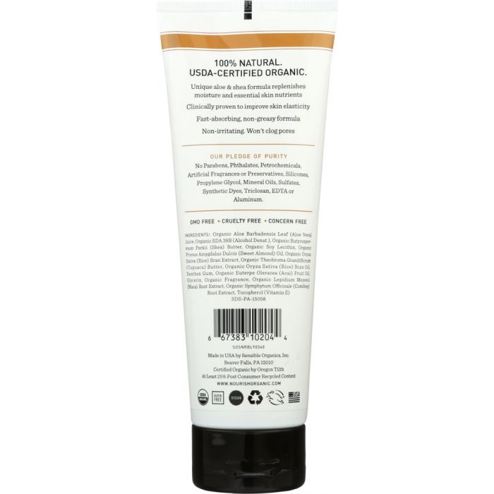 Replenishes moisture and essential nutrients with aloe and shea formula Clinically proven to improve elasticity Non-greasy, absorbs quickly Non-irritating, won’t clog pores Smooth on this soothing, naturally scented lotion made with organic aloe, rice protein, acai, essential oils and Vitamin E. Perfect for even the most sensitive skin. Certified Organic Cruelty-Free Recyclable Gluten-Free Vegan
