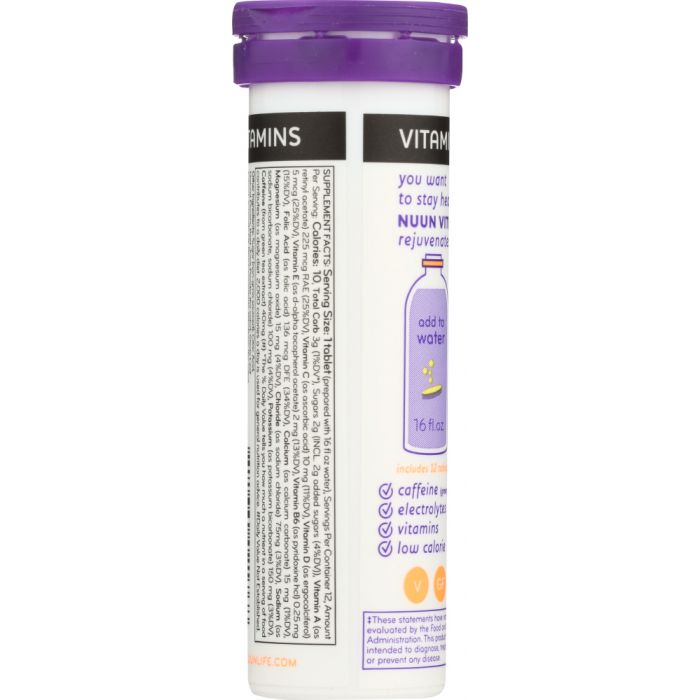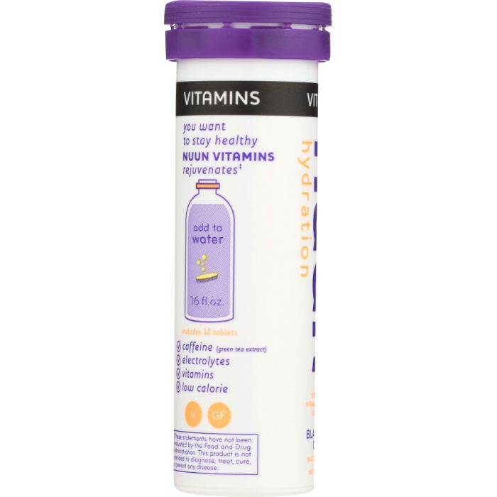 drink anytime for daily health and hydration. nuun vitamins hydrates better than water alone, so you can achieve your daily personal best nuun vitamins provides what your body needs -- the 11 vitamins and minerals most of us don’t get enough of, plus the optimal balance of electrolytes for everyday activity make your water work harder for your health whether you're at work, on the go, or simply trying to get in your 64oz per day nuun vitamins comes in 6 flavors: blueberry pomegranate, tangerine lime, grapefruit orange, strawberry melon, blackberry citrus (with caffeine), and ginger lemonade (with caffeine)
