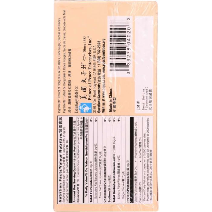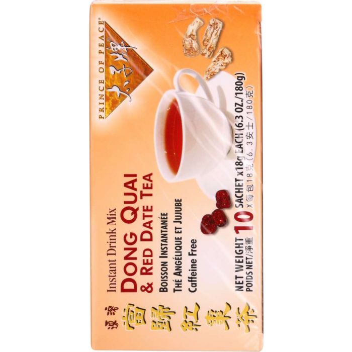 Prince of Peace® brings you all the natural benefits of Dong Quai and Red Date in our special proprietary blendof Instant Dong Quai and Red Date. Each bag of Prince of Peace ® Dong Quai and Red Date Tea is extracted from 30 gram of raw Dong Quai and Red Date. Dong Quai, also known as Angelica or Dang Qui, has been a highly treasured herb in the Orient for thousands of years. It is often referred to as “female ginseng”. Red Date is neutral and warm in nature with a sweet taste. This delicious and nutritious tea is ideal for home and travel.