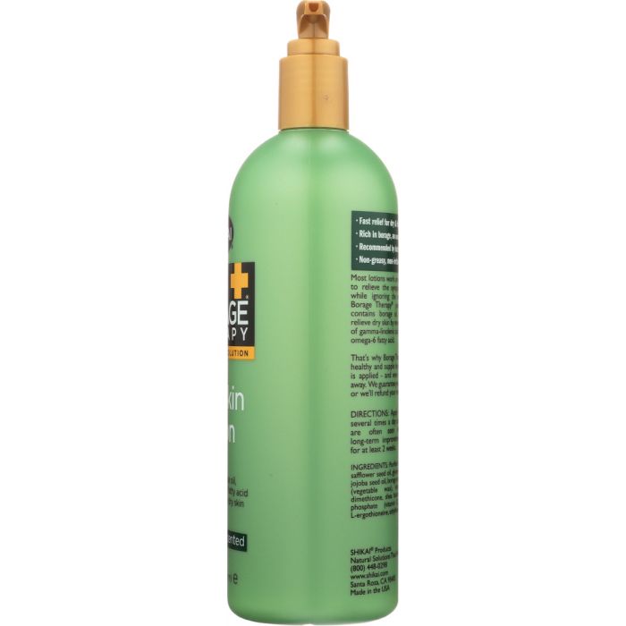 Fast relief for dry & itchy skin Rich in borage, an omega-6 fatty acid Recommended by doctors & patients Most lotions work on the skin's surface to relieve the symptoms of dry skin, while ignoring the real cause that lies within the cells. Borage Therapy® provides more: it promotes healing at the cellular level by reversing a deficiency of the critical omega-6 fatty acid, GLA. Borage Therapy keeps skin healthy and supple long after the lotion is applied – and even after it's washed away.