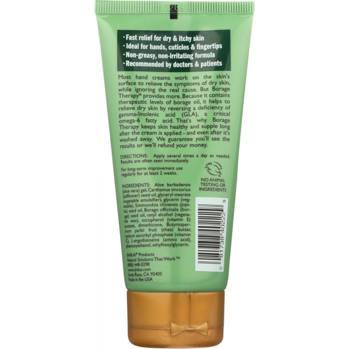 Description The Natural Solution Clinically Proven to Restore Healthy Skin at the Cellular Level Fast Relief for Dry & Itchy Skin Ideal for Hands, Cuticles & Fingertips Non Greasy, Non-Irritating Formula Clinically Proven & Doctor Recommended Most hand creams work on the skin's surface to relieve the symptoms of dry skin, while ignoring the real cause that lies deep within the skin. But Borage Therapy provides more. It promotes healing at the cellular level by reversing a deficiency of the critical omega-6 fatty acid, GLA. That's why Borage Therapy keeps skin healthy and supple long after the cream is applied - and even after it's washed away. Warnings Apply several times a day as needed. Results are often seen immediately. For long-term improvement use regularly for at least 2 weeks.