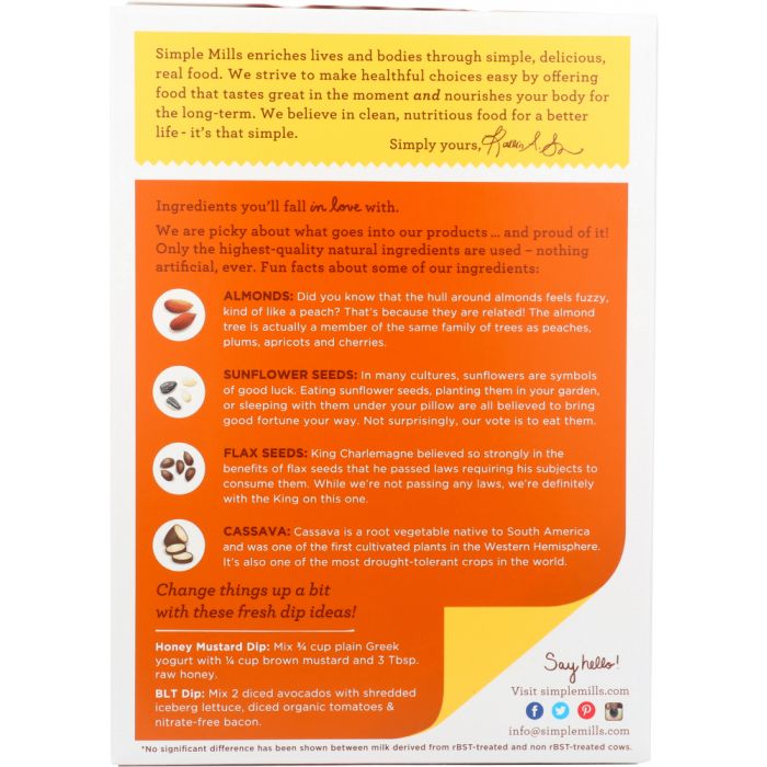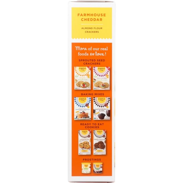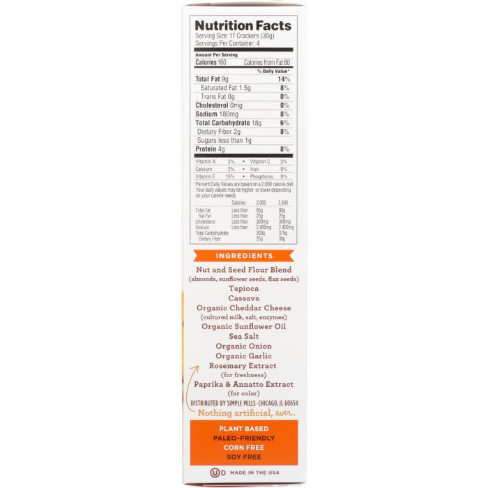 A better for you version of your favorite cheesy childhood crackers, with taste & nutrition that adults and kids adore. Made with a wholesome blend of almond flour, sunflower seeds & flax seeds 3g of protein per serving Good source of Vitamin E Made with High-Oleic, Cold-pressed, Organic Sunflower oil & Organic, RBST-free Cheddar Cheese Certified Gluten-free; free of Grains, Soy, Corn & Gums/Emulsifiers Non-GMO Project Verified