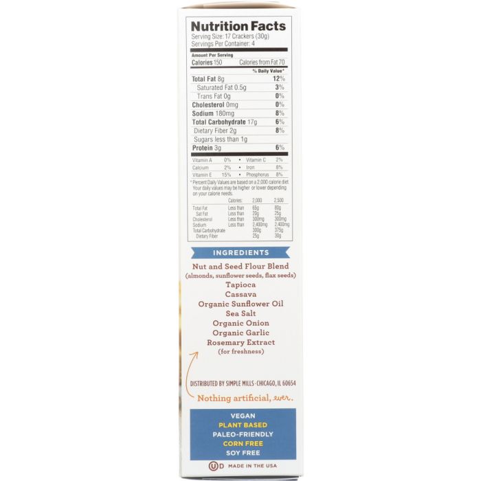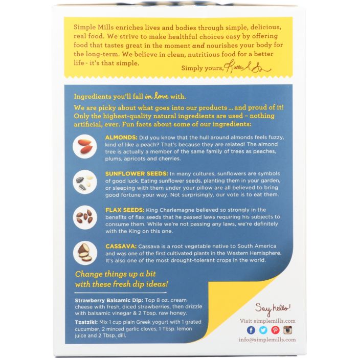 The ultimate snack. Grab a handful and fuel up for your next big adventure! Made with a wholesome blend of almond flour, sunflower seeds & flax seeds 3g of protein per serving Good source of Vitamin E Made with High-Oleic, Cold-pressed, Organic Sunflower oil Certified Gluten-free; free of Grains, Soy, Corn, Dairy & Gums/Emulsifiers Paleo-Friendly Non-GMO Project Verified