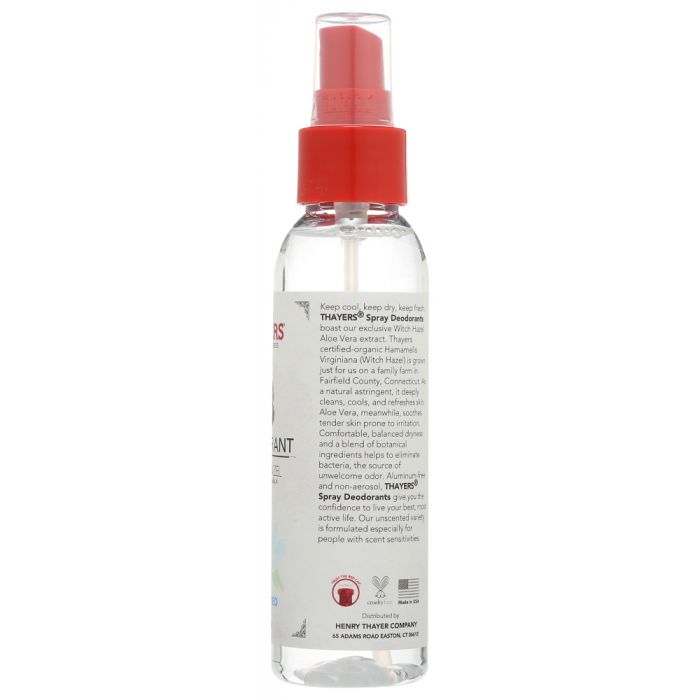 Keep cool, keep dry, keep fresh. THAYERS® Spray Deodorants boasts our exclusive Witch Hazel Aloe Vera extract. Thayers certified organic Hamamelis Virginiana (Witch Hazel) is grown just for us on a family farm in Fairfield County, Connecticut. As a natural astringent, it deeply cleans, cools, and refreshes skin. Aloe Vera, meanwhile, soothes tender skin prone to irritation. Comfortable, balanced dryness, and a blend of botanical ingredients help to eliminate bacteria, the source of the unwelcome odor. Aluminum-free and non-aerosol, THAYERS® Spray Deodorants give you the confidence to live your best, most active life. Our unscented variety is formulated especially for people with scent sensitivities.