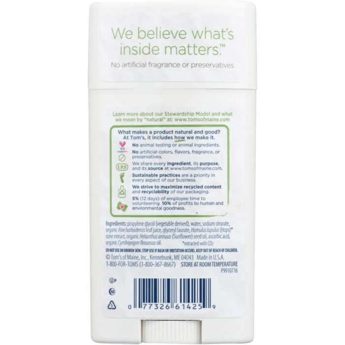 At Tom’s what makes our products good is how we make them with no artificial fragrance or preservatives and no animal ingredients or testing, ever. This effective line of long-lasting, aluminum-free, deodorant sticks uses odor-fighting hops and the mineral zinc to provide 24-hour odor protection to help keep you feeling fresh throughout the day, while the natural fragrance helps you smell and feel your best!