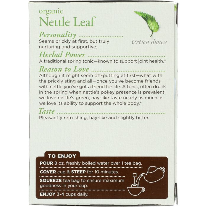 PersonalitySeems prickly at first, but truly nurturing and supportive. Herbal PowerA traditional spring tonic—known to support joint health.* Reason to LoveAlthough it might seem off-putting at first—what with the prickly sting and all—once you’ve become friends with nettle you’ve got a friend for life. A tonic, often drunk in the spring when nettle’s pokey presence is prevalent, we love nettle’s green, hay-like taste nearly as much as we love its ability to support the whole body.* TastePleasantly refreshing, hay-like and slightly bitter. *These statements have not been evaluated by the Food and Drug Administration. This product is not intended to diagnose, treat, cure, or prevent any disease.