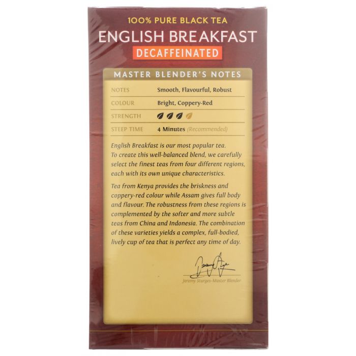 English Breakfast is our most popular tea. To create this well-balanced blend, we carefully select the finest teas from five different regions, each with its own unique characteristics. Tea from Kenya and Malawi provides the briskness and coppery-red colour while Assam gives full-body and flavour. The robustness from these regions is complemented by the softer and more subtle teas from China and Indonesia. The combination of these varieties yields a complex, full-bodied, lively cup of tea that is perfect any time of day.