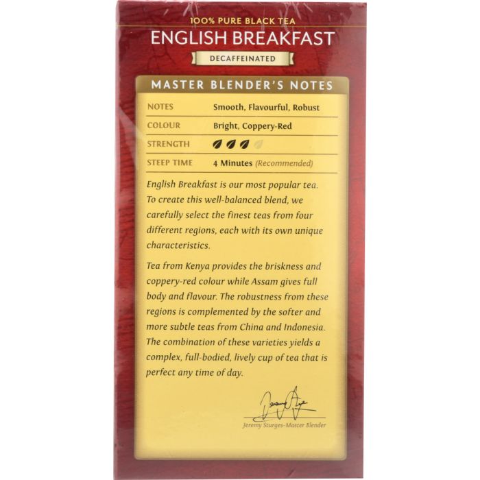English Breakfast is our most popular tea. To create this well-balanced blend, we carefully select the finest teas from five different regions, each with its own unique characteristics. Tea from Kenya and Malawi provides the briskness and coppery-red colour while Assam gives full-body and flavour. The robustness from these regions is complemented by the softer and more subtle teas from China and Indonesia. The combination of these varieties yields a complex, full-bodied, lively cup of tea that is perfect any time of day.