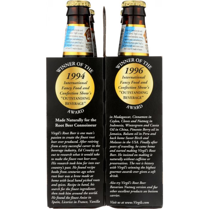 Virgil’s is a gourmet root beer. We’re what Ben and Jerry’s is to ice cream, what Dom Perignon is to champagne. We’re a micro-brewed root beer made with all-natural ingredients. We use herbs imported from around the world and unbleached pure cane sugar. Virgil’s is a superb blend of spices and herbs gathered from the world over; anise, licorice, vanilla (bourbon), cinnamon, clove, wintergreen, sweet birch, molasses, nutmeg, pimento berry oil, balsam oil and cassia oil. Some root beers claim to be “cold-brewed”. This is merely another term for the filtering process that yields common soda. Even so-called premium root beers like Stewarts, IBC and Weinhard’s are not hand crafted brews like Virgil’s. Only Virgil’s Microbrewed Root Beer is truly “brewed”. Serve Chilled (Without Ice)